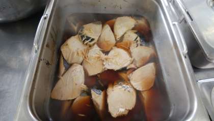 今日はミニバットに水、しょうが、砂糖、みりん、こいくちしょうゆ、料理酒をあわせたタレとなまりぶしをいれて焼き物機で蒸し焼きにしました。