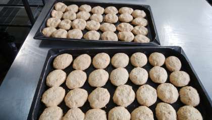 とうふ、ツナ、でんぷん、たまねぎ、砂糖、塩、こいくちしょうゆ、を合わせて練るようにまぜて形をつくって焼き物機で焼きました。