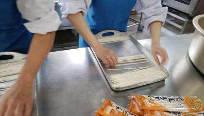 *うどん(乾めん)に異物がついていないか検品しているところです。