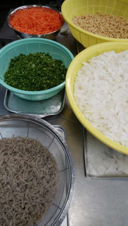 今日の給食のかす汁には、さけ、つきこんにゃく、うすあげ、だいこん、にんじん、青ねぎが入っています。