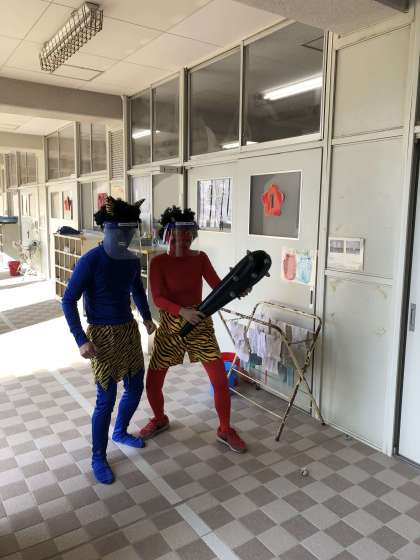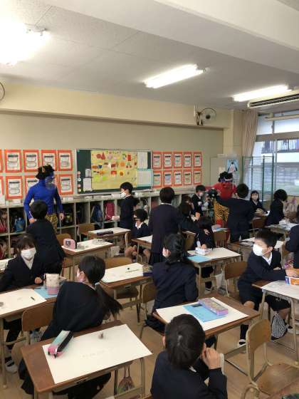 本日午前11時頃、本校低学年教室に赤鬼と青鬼が現れました。子どもたちはなぜか用意していた豆(新聞紙を丸めたもの)で鬼たちを撃退していました。鬼たちも今年はフェイスシールドの下にマスクも着用した完全防備で現れました。