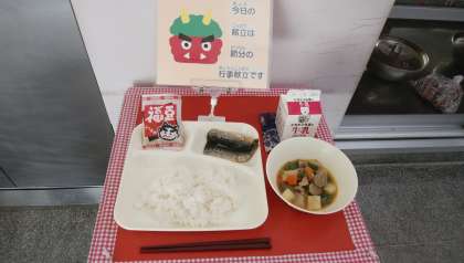 =給食では、節分の行事献立として、「いわしのしょうがじょうゆかけ」と「いり大豆」がでました。=