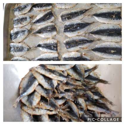 *いわしの開きに料理酒で下味をつけてから焼き物機で焼きました。焼いたいわしに、しょうが汁、砂糖、みりん、こいくちしょうゆをあわせたタレをかけていただきました。