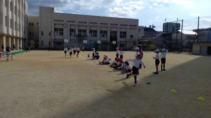 3年生は一人10周を走ります。担任の那須先生のスタートの合図とともに、子ども達は一斉に元気よく走り出し、ペアのお友達から「あと○周!」などと声をかけられながら、頑張っていました。