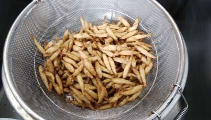 わかさぎは、ししゃもと同じキュウリウオ科の魚です。油であげる、焼く、煮るなどいろいろな調理で味わうことができ、骨がやわらかいため、丸ごと食べることができます。今日の「わかさぎフライ」はかみごたえがあります。大きな釜でこんがりあげました。(写真中)