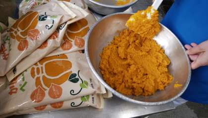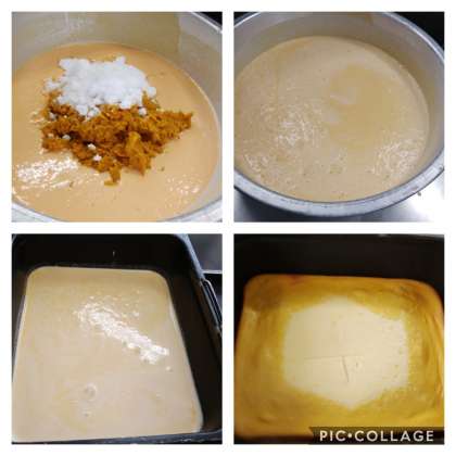 ・液卵、かぼちゃペースト、砂糖、、牛乳、クリームを混ぜ合わせてミニバットにいれて焼き物機で焼きました。(写真下)
