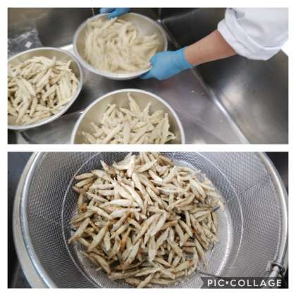 冷凍のきびなごを検品した後、大きな釜であげています。