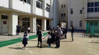 子ども達が、その紙筒を握って2階に向かって投げ上げていました。3年1組担任の那須先生が考案した「投げる力増し増しマシーン」(※勝手に命名しました)。1・2年生も3年生のアドバイスを受けながら楽しそうに挑戦していました!