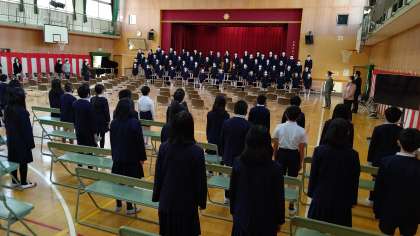 予行の後には、6年生の卒業を祝って5年生代表児童からのあいさつがありました。また、「大空をむかえる朝」「さよならは言わないで」の歌のプレゼントもありました。最後に6年生からのお礼の言葉、5・6年合同での「大切なもの」の合唱と続きました。