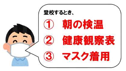 早寝早起き、しっかり食べる、手洗いやうがいをする、そしてマスクを忘れない等、基本的な健康習慣をこころがけ、毎日の検温や「健康観察表」への記録は、お子様の健康と安全を守る行動として、習慣化していただきますようどうかご家庭のご協力をお願いいたします。