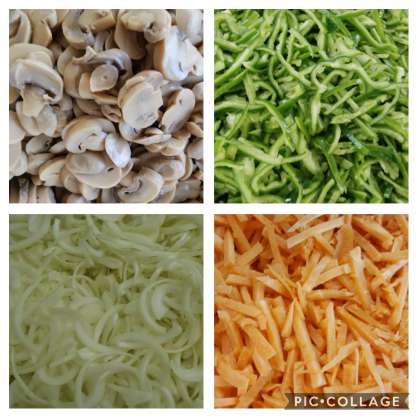 ・ミートソースには、たまねぎ、にんじん、ピーマン、にんにく、マッシュルーム、牛ひき肉と豚ひき肉がはいっています。