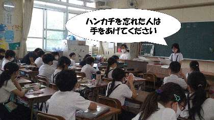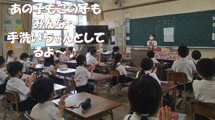 火曜日に、保健委員会の児童が、清潔検査の時に「手洗いの大切さ」と「手洗いゴッシゴシ」の歌の放送にあわせて皆と一緒に手の正しい洗い方を練習しました。
