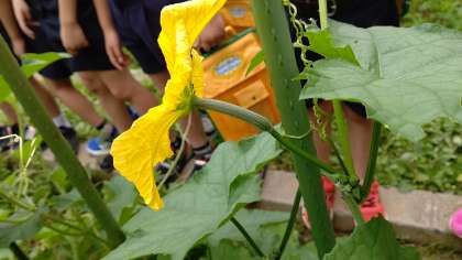 4年生の花壇ではヘチマとヒョウタンの雌花が実を膨らませ始めていました。