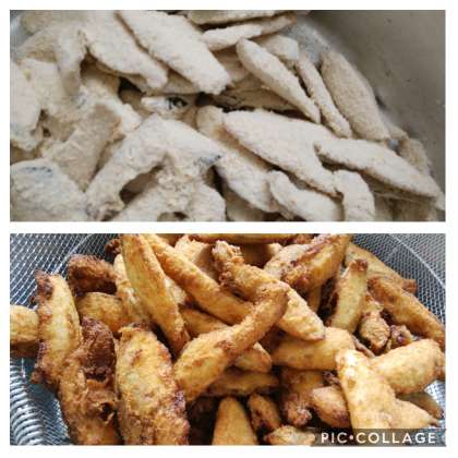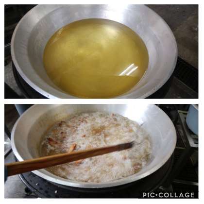 冷凍のサーモンフライを大きな釜であげました。