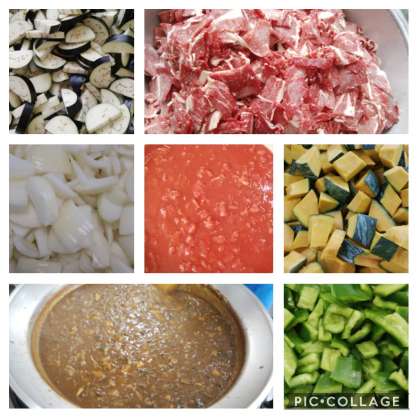 今日のカレーライスには、牛肉の他に夏野菜のかぼちゃ、なす、ピーマンなど夏を感じることのできる野菜がはいっていました。他には、たまねぎ、トマト缶などがはいっていました。