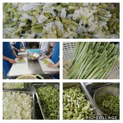 グリーンアスパラガスとキャベツをそれぞれ蒸した後、砂糖、塩、ワインビネガー、綿実油で作ったドレッシングであえました。