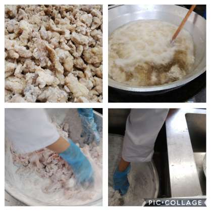 ・鶏肉はしょうが汁、にんにく、塩、こしょうで下味をつけます。つけ汁をきってでんぷんをまぶして油であげました。