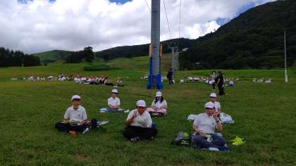 避難訓練の後、昼食のおにぎり弁当を食べています。