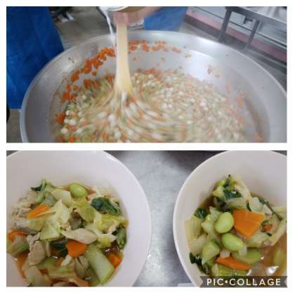 上の写真は、中華煮にとろみをつけるためでんぷんを流しいれています。