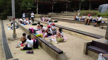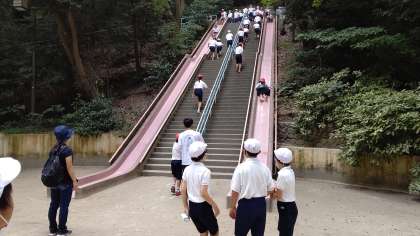 お弁当の後は、短い時間でしたが遊具のある公園で遊びました。とても長くて高さのあるすべり台があり、スリルを味わいながらすべり下りていました。勢い余って最後にしりもちをつく子が続出でした。