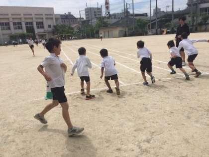 運動委員会では、50m走の記録を伸ばすために、50m走のコースを運動場に作り休み時間に練習のお手伝いをしています。