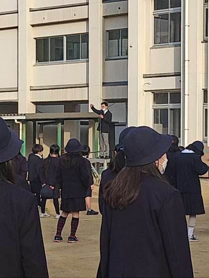 今日は児童朝会が行われました。風が冷たく、寒い中での朝会となりましたが、児童たちはみんな気を引き締めて整列しました。今回は、読書を100冊達成した低学年の児童と、5000ページ達成した高学年児童の表彰がありました。寒い季節に室内で過ごす時間が多いこともあり、みんな読書に親しんでいるようです。そのあと、校長先生から阪神淡路大震災についての話がありました。27年前の今日の大阪の様子や被災した地域の様子を教えていただきました。