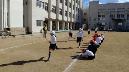 昨日の1年2組、3年2組、5年1組、6年1組に続き、今日は2年2組と3年1組が記録会を実施しました。