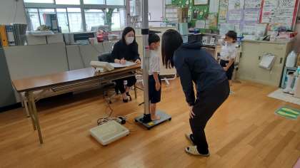 1年生は、初めての2測定でした。養護教諭の指示の下、体重計に乗り、詰めが切れているかどうか確認してもらい、身長を測定しました。卒業するころには40センチくらい伸びているかもしれませんね。どんどん学校生活に慣れていっています。