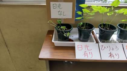 5年生は発芽に必要なものは何かを調べています。水、空気、肥料、日光、適当な温度。それぞれ比較実験することを通して調べていきました。