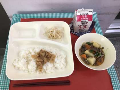 『ごまかかいため』…ゆでたたけのこをいためてみりん、こいくちしょうゆ、湯を加えてさらにいためます。最後にかつおぶしといりごまを加え、 ごはんの上にそえていただきました。