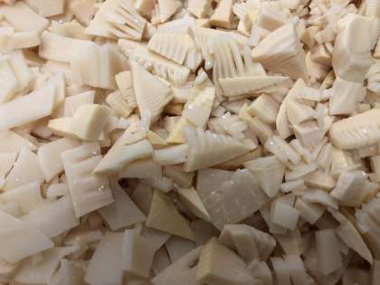 わたしたちが食べている「たけのこ」は竹の若い茎の部分です。芽が地面から出る前に土が盛り上がってくるのを目安に掘り出します。たけのこがたくさん収穫できるのは、4月から5月ごろです。今日は『ごまかかいため』に使っています。