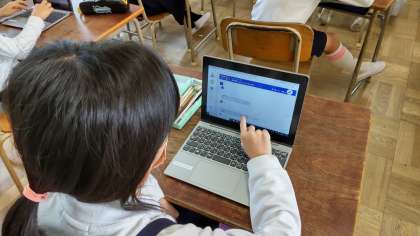 一人一台パソコンを使って、国語科や算数科を中心に、デジタルドリルを使って、既習事項の定着を図っています。おうちに持って帰って、宿題としてする場合もあります。「心の天気」なども入力し、子どもたちのストレスチェックにも使っています。