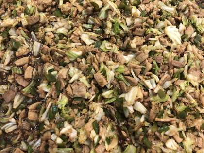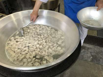*今日の給食では、豚バラ肉をゆでてから、他の材料と一緒にいためて味付けをしています。調理員さんが豚バラ肉のアクを何度も丁寧にとってくれています。
