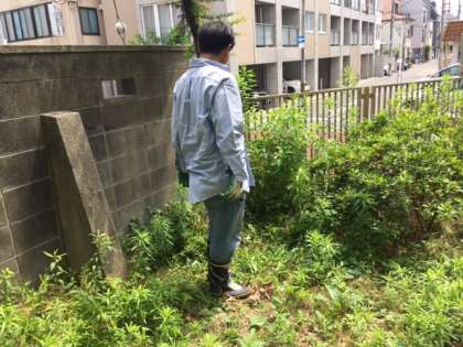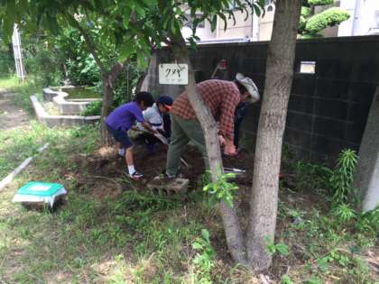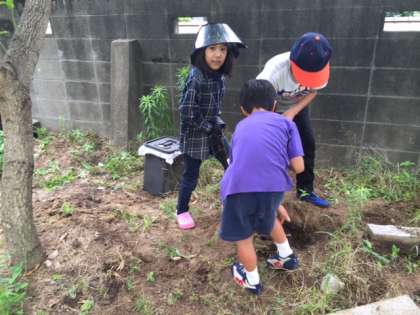 校舎の裏で何やら穴を掘っています。