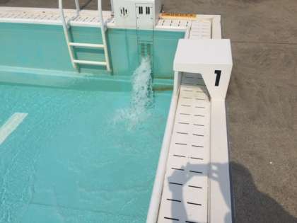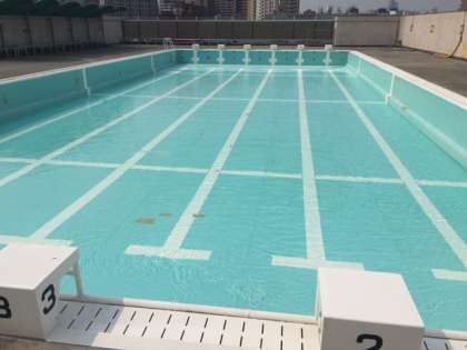 明日からプールで水泳学習が始まります。管理作業員さんが高圧洗浄機で汚れを落としてくれたあと、教職員で仕上げをしてプールはピッカピッカです。現在注水中です。6時間ぐらいで満杯になります。注水は満水時に自動で止まります。水は2週間に1回換水します。その間は濾過機で循環し、カルキを入れ水質を保っています。