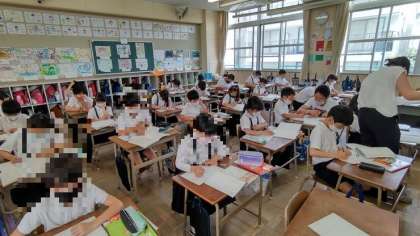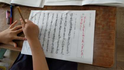 三年生は、『はりねずみと金貨』という読み物教材を読んで、あらすじをまとめる学習をしていました。繰り返しの言葉は削除し、物語のつながりがわかるように接続詞を工夫し、同じ言葉をわかりやすく言い換えて「あらすじ」をまとめていきました。