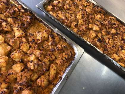 鶏肉に、にんにく、塩、カレー粉、こしょう(粗びき)、マヨネーズ、ケチャップを合わせて焼き物機で焼きました。