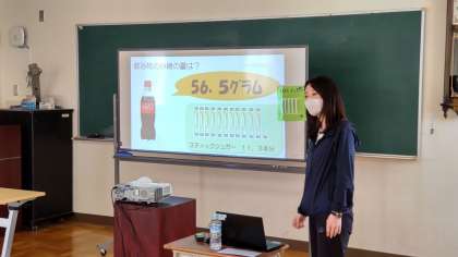 今日は、ジュース類に含まれている砂糖の量についてのお話でした。商品名を出して悪いのですが、コーラやファンタなどの清涼飲料水1本に含まれている砂糖は、スティックシュガー分でいうと12本だそうです。暑くなってきて、水分をとるときは、お茶や水にして、できるだけ清涼飲料水は避けましょうねという内容でした。
