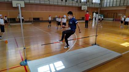 都島区の体力向上の取り組みとして、年3回、いろいろな体育(主に器械運動)の講師が派遣されて運動能力の向上に取り組んでいます。今回、4年生は「走り高跳び」にチャレンジし、リズムよく飛ぶことを教わっていました。