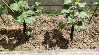 5月中旬に「タンポポ教室」で、キュウリやミニトマト、サツマイモなどの苗を植えましたが、キュウリの実が早くもできました。ちょうど食べごろです。これ以上大きくするとキュウリの成長が止まってしまいます。これから約1か月くらいどんどんキュウリができていきます。どんどん収穫してほしいです。