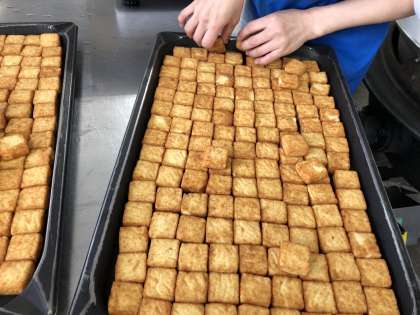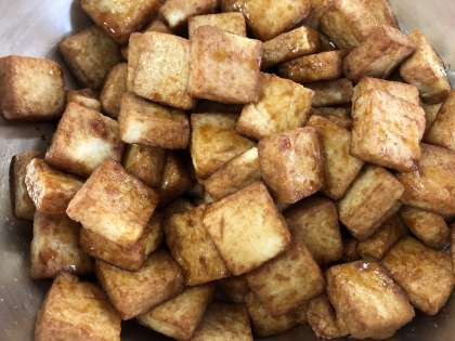 あつあげを焼き物機で焼いた後、砂糖、こいくちしょうゆ、トウバンジャンをあわせたタレをかけていただきました。