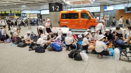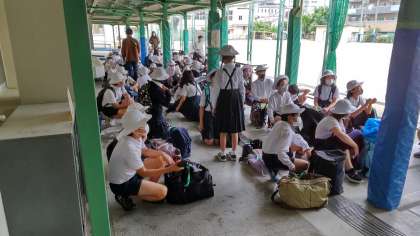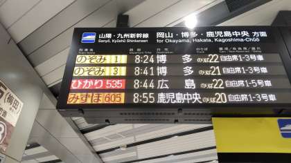 朝のラッシュアワーのなか、クラスは3分割して乗りました。新幹線に乗り換えます。ひかり535号広島いき。8時44分発車です。