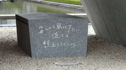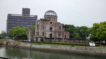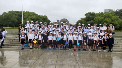 小雨のなか、原爆ドームやいろいろな碑を巡りました。学年で写真をとりました。お昼のお好み焼きの受けとりに手間取っています。