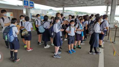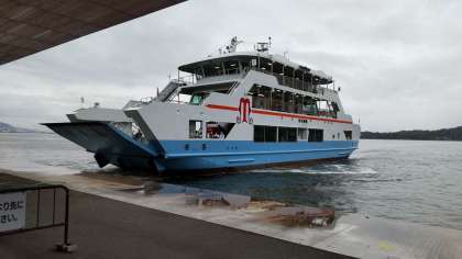 今からフェリーに乗って、宮島に渡ります。車椅子スペースもあります。バリアフリーになっています。