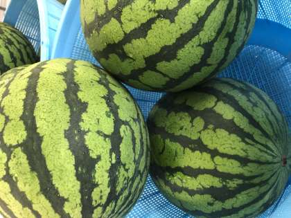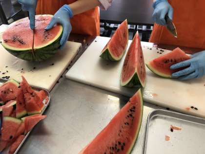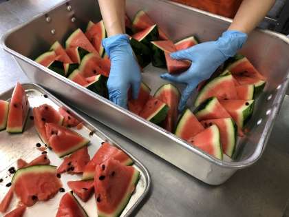 今日は夏が旬の「すいか」が給食ででました。鳥取県産の甘いすいかです。ひとつのすいかを調理員さんが1/64に切ってくれました。