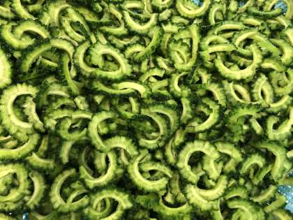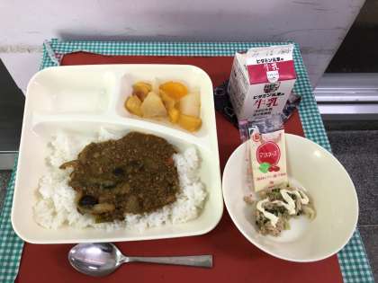 *今日の献立は、学校給食献立コンクール優秀賞作品です。「夏野菜のカレーライス」には、ピーマン、トマト、なすなど夏野菜がはいり、夏バテ予防になると思い考えたそうです。 「ゴーヤとツナのマヨネーズ風味」は、食べやすいようにマヨネーズ(袋)をかけていただきました。