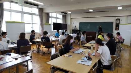 終業式が終わり、夏休み1日目。我々は全員出勤して、朝の9時から「ホワイトボードミーティング」の研修会を3時間たっぷりとしました。ちょんせいこさんという講師の方をお迎えして、授業でホワイトボードを使って「思考の可視化」や「授業の活性化」をしようと研修していました。お昼からも若手の教員を中心にメンター研修でりかの「てこ」の実技研修会に取り組みます。夏休みは、教職員の力量をあげる良い機会となっています。