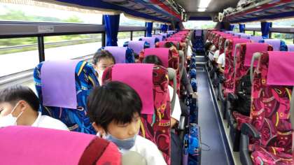 バスのなかでキャンプファイアーの歌を練習しています。が、あんまり歌ったことがないみたいですね。