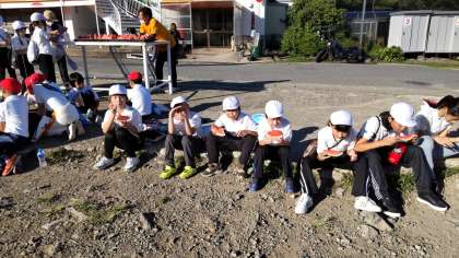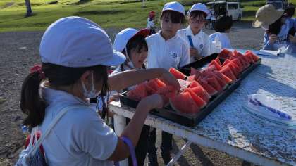 オリエンテーリングを終えたグループからごほうびスイカをいただいています。みんなよくがんばりました。これから、お風呂です。