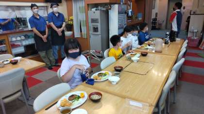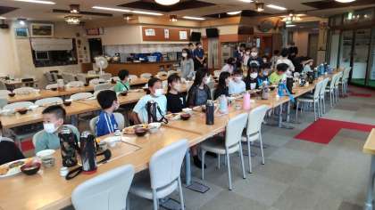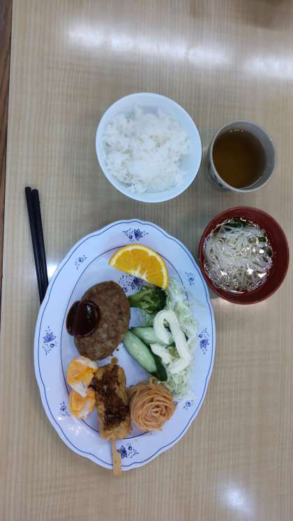 思いのほか、オリエンテーリングに時間がかかりましたけど、お風呂に入ってから、40分遅れで食事をいただきます。ハンバーグ定食です。ゲレンデを見ながらいただきます。